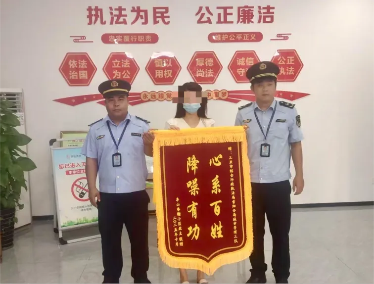“太感谢你们了!终于能睡个安稳觉了!”近日,迎宾路某小区居民满心欢喜地将一面印有“降噪有功 心系百姓”的锦旗郑重送入市综合行政执法局吉阳分局执法人员手中,脸上洋溢着困扰解决后的舒心笑容。这面锦旗背后,不仅是一段执法为民、快速解民忧的暖心故事,更折射出基层执法部门在“柔性治理”与“高效服务”中探索出的民生守护路径。