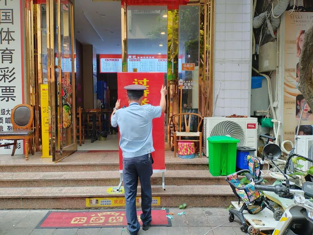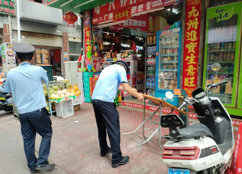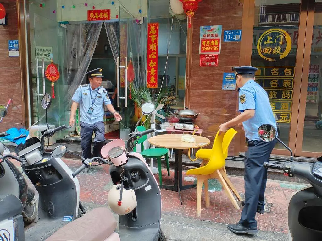 在一家餐饮店门前,两名执法人员弯腰合力,将摆放在门口的桌子稳稳抬进屋内。店主连忙道谢:“辛苦了,麻烦你们了!”执法人员笑着摆摆手:“没事,咱们一起把环境弄好。”